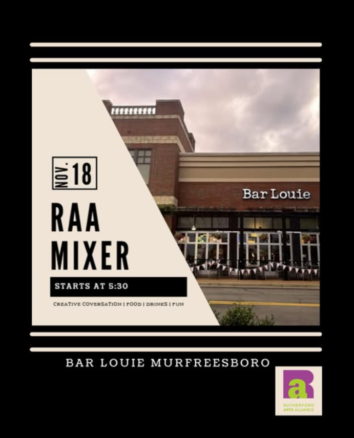 RAA members and friends are invited to our last monthly mixer for 2025, hosted by Executive Director Jeff Lysyczyn. Join us Tuesday, November 18, at 5:30pm at Bar Louie, located at The Avenue, 2615 Medical Center Parkway Suite 2395, Murfreesboro.