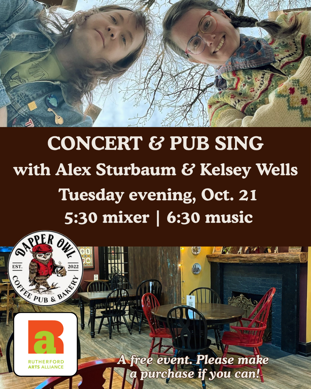RAA members and friends are invited to our October monthly mixer, hosted by Executive Director Jeff Lysyczyn. Join us Tuesday, October 21, at 5:30pm at the Dapper Owl Coffee Pub in Murfreesboro. Following the mixer hour, there will be a one-hour concert and pub sing from6:30-7:30 with traditional musicians Alex Sturbaum and Kelsey Wells. Learn more about Alex and Kelsey below.
