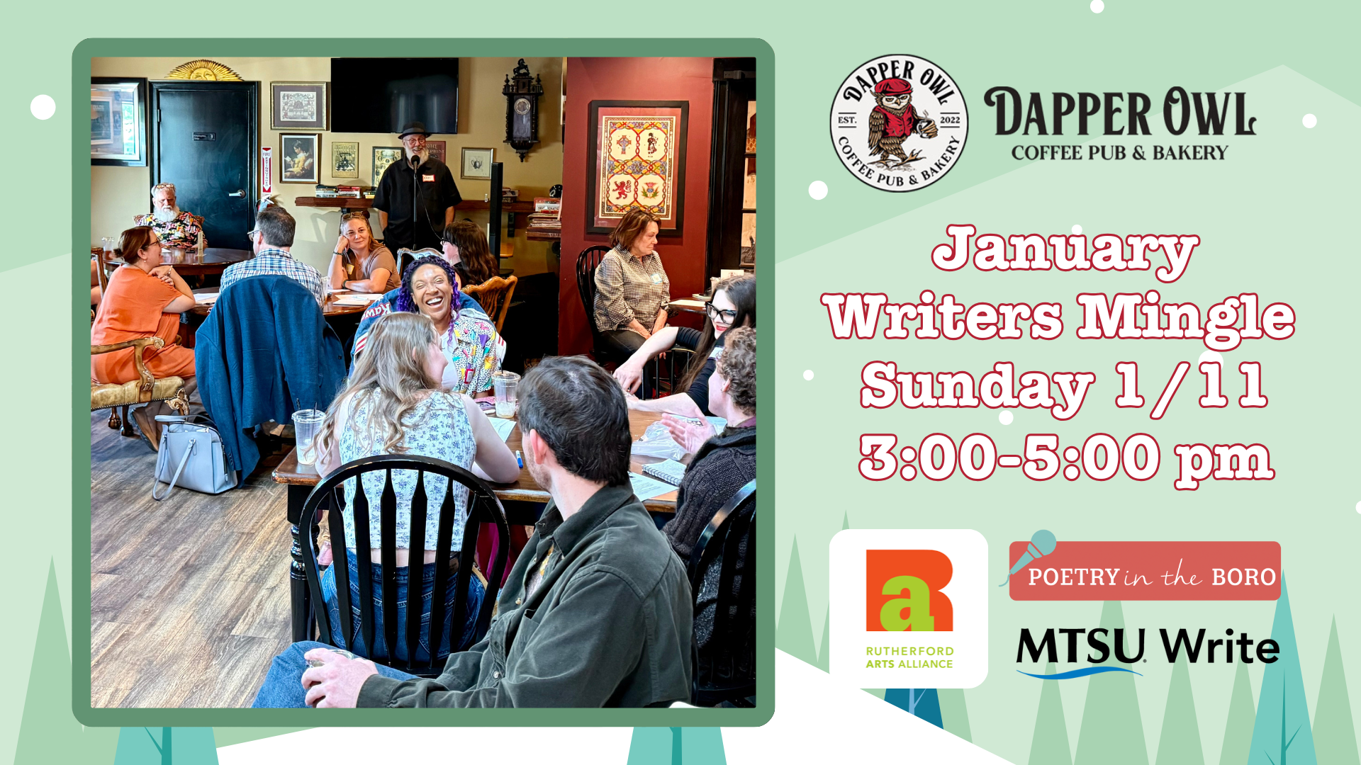 Sponsored by the literary interest group of the Rutherford Arts Alliance, Poetry in the Boro, and MTSU Write, this event is free and open to writers of all genres and experience levels (including “thinking about writing”). We encourage you to make a purchase from Dapper Owl in order to support this local business!