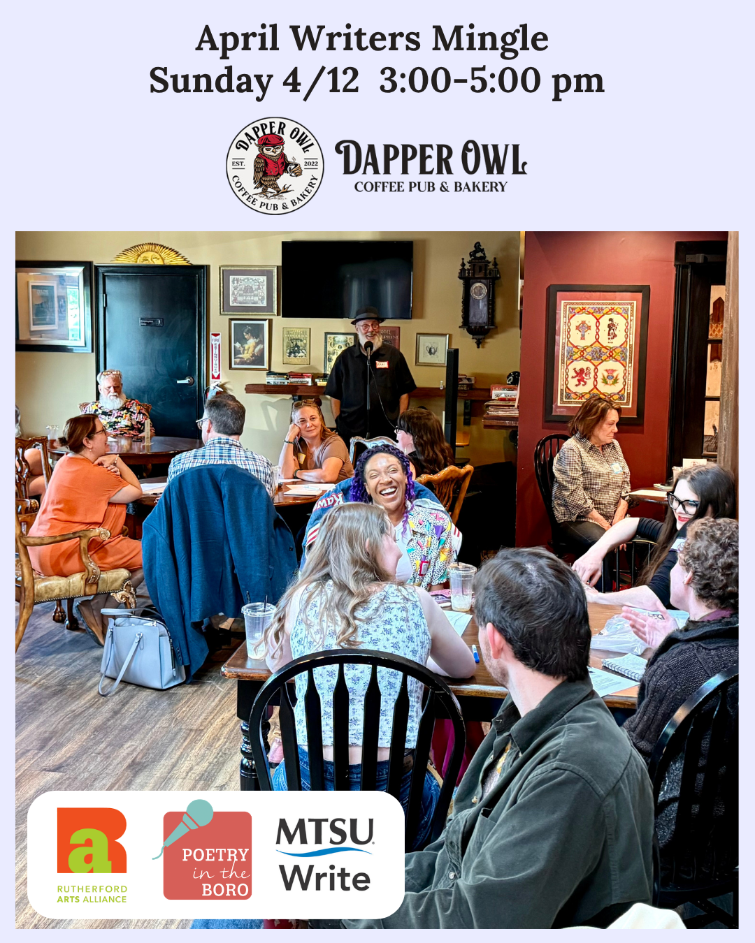 Sponsored by the literary interest group of the Rutherford Arts Alliance, Poetry in the Boro, and MTSU Write, this event is free and open to writers of all genres and experience levels (including “thinking about writing”). We encourage you to make a purchase from Dapper Owl in order to support this local business!