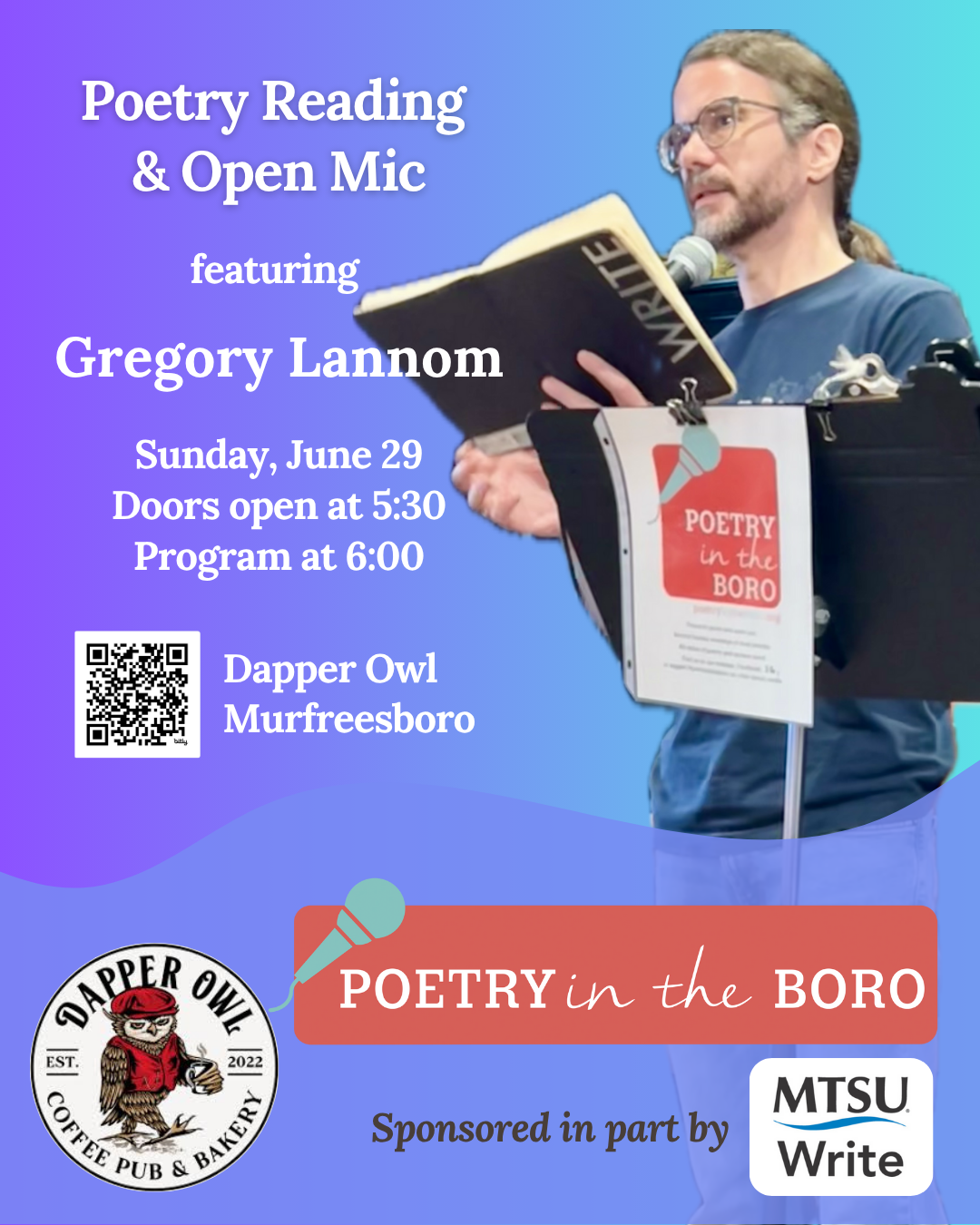 Sunday, June 29th, 6:00 PM, at Dapper Owl in Murfreesboro: Poetry in the Boro Featured Reading and Open Mic