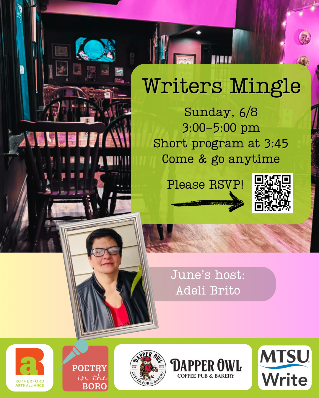 Sunday June 8th, 3-5 PM, at Dapper Owl in Murfreesboro: Writers’ Mingle hosted by Adeli Brito