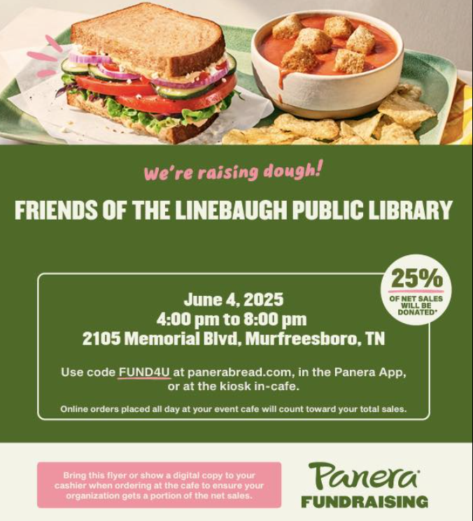 Wednesday, June 4th, 4-8 PM, at Panera Bread (2015 Memorial Blvd., Murfreesboro): Friends of Linebaugh Library Fundraiser