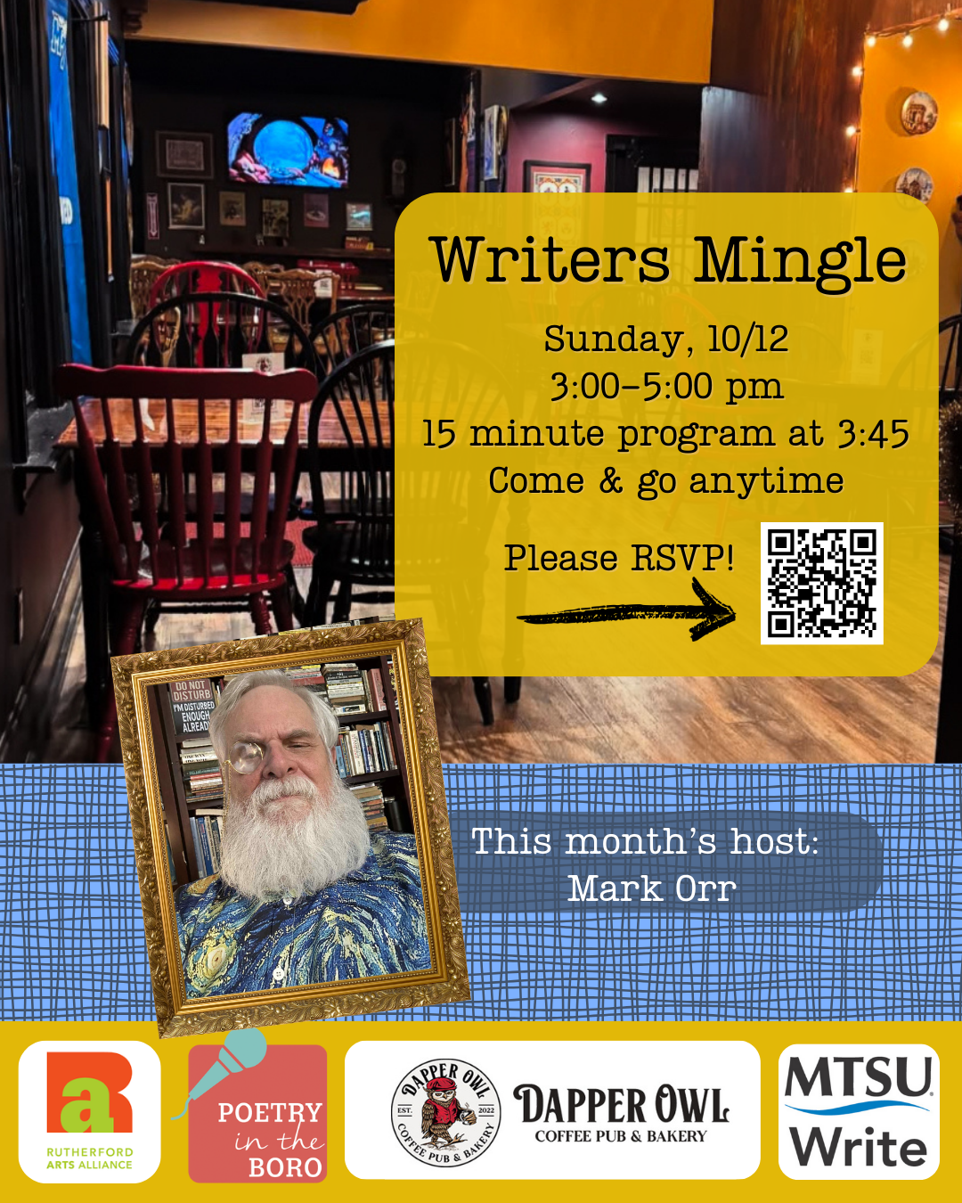 Connect with other writers in a relaxed setting—and even sit down and write for a bit, if you’re so inspired. Come and go anytime. Help us plan by RSVPing on this Google form. Sponsored by the literary interest group of the Rutherford Arts Alliance, Poetry in the Boro, and MTSU Write, this event is free and open to writers of all genres and experience levels (including “thinking about writing”). This month, we’ll be hearing from the lovable Mark Orr, who writes scary mystery tales, including two novels and a bunch of shorts stories, along with other stuff. He spent some time as a magazine editor as well. He currently blogs and plays with his grandchildren. Click the image for more info!